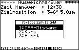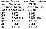 Zum gewählten Zeitpunkt des Manövers wird zunächst Peilung und Abstand zum Ziel angezeigt, man kann auswählen, ob man einen vorgegebenen Sicherheitsabstand einhalten möchte, einen neuen Eigenkurs oder eine neue Eigengeschwindigkeit wählen möchte.