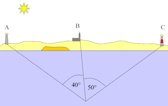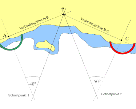 Das Verfahren sieht vor, den Winkel zwischen je zwei von insgesamt drei Objekten A, B und C zu messen und daraus den Standort bestimmen zu können.