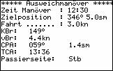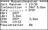 Zum gewählten Zeitpunkt des Manövers wird zunächst Peilung und Abstand zum Ziel angezeigt, man kann auswählen, ob man einen vorgegebenen Sicherheitsabstand einhalten möchte, einen neuen Eigenkurs oder eine neue Eigengeschwindigkeit wählen möchte.