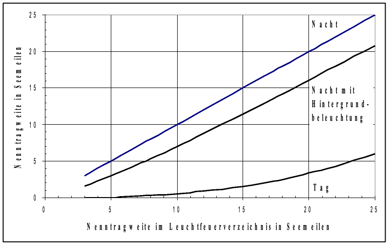 Das folgende Diagramm erlaubt die Ermittlung der Nenntragweiten bei Nacht mit Hintergrundbeleuchtung sowie bei Tage, jeweils ausgehend von der im Leuchtfeuerverzeichnis angegebenen Nenntragweite: