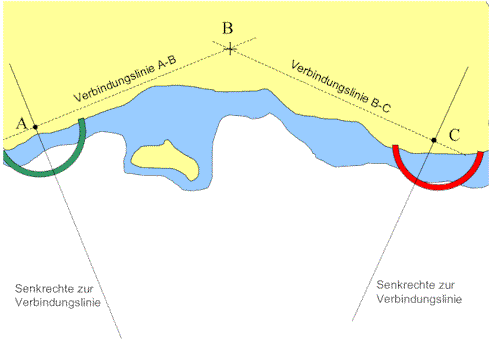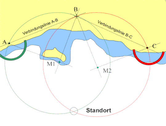 Das Verfahren sieht vor, den Winkel zwischen je zwei von insgesamt drei Objekten A, B und C zu messen und daraus den Standort bestimmen zu können.